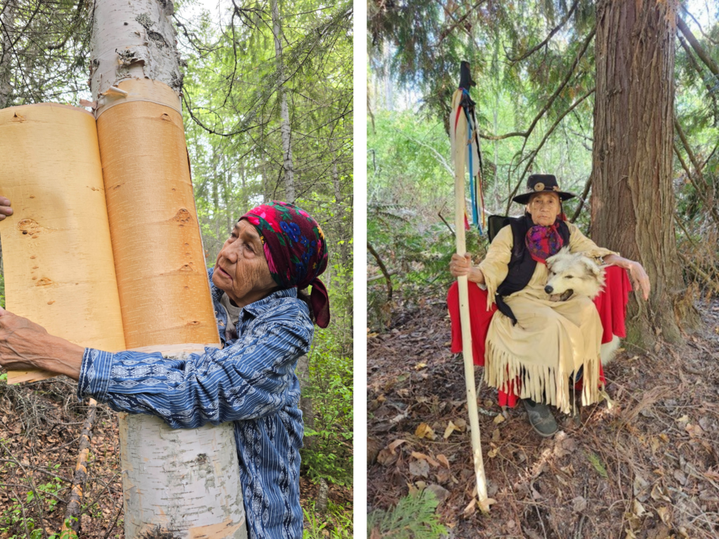 Minnie Kenoras (left) demonstrating how to harvest birch bark and (right) holding the Grandmothers’ Bear staff with the white wolf Sheena, Secwepemc Nation village protector.